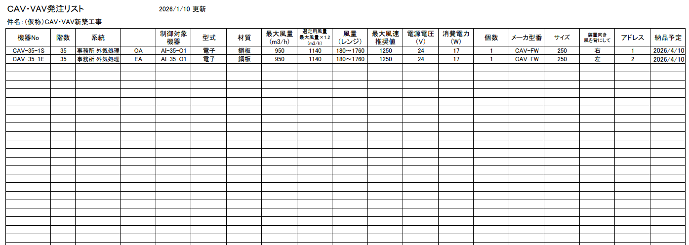 施工図から一台ずつCAVやVAVを拾い出し、発注リストを作る作業。非常に地味で神経を使いますが、実はここが施工管理の腕の見せ所です。